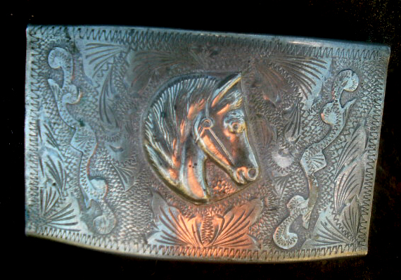 This is one of the older silver cowboy belt buckles that features a horse in the center of a beautiful design. This buckle can take up to a 2 inch belt. This is a hard-to-find collectible buckle.