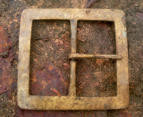 This old solid brass buckle is a piece of buckle history, excavated from Virginia and dating back to the early 1600's. This beautiful old buckle measures 4-3/8 inches wide and 4" high; good patina. Usually ships in 4-7 business days.