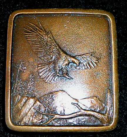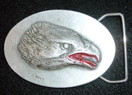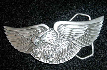 Pewter Attacking eagle buckle manufactured by Indianna Metal Craft, 1980. Buckle measures 4-1/8 inches wide by 1-5/8 inches tall and will accept a 1-1/2 inch wide belt.