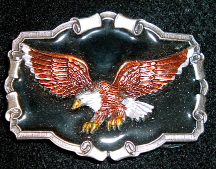 Collectible Heavy Pewter buckle with brown and silver eagle in flight. Buckle measures 3 inches wide by 1-7/8 inches tall and will accept a 1-1/2 inch wide belt.
