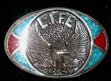 Beautiful pewter buckle of eagle surrounded by inlaid turquoise and coral. Buckle measures 3 inches wide by 2 inches tall and will accept a 1-5/8 inch wide belt.