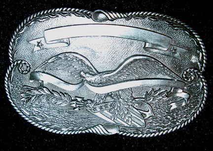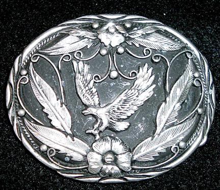 Silver plate eagle in flight oval belt buckle. Buckle measures 3-3/4 inches wide by 2-3/4 inches tall and will accept a 1-1/2 inch wide belt.