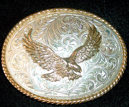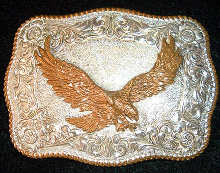 Spectular Silver and Gold Plate Eagle in Flight buckle by Crumrine Manufacturing company. Buckle measures 3-1/8 inches wide by 2-1/2 inches tall and will accept a 1-1/2 inch wide belt.