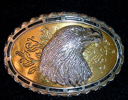 Silver eagle on gold tone belt buckle . Oval buckle measures 3-7/8 inches wide by 2-8/8 inches tall and will accept a 1-1/2 inch wide belt.