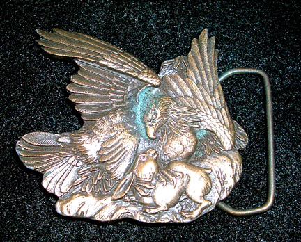 Spectacular Solid brass eagle with a rabbit design by Bergamot Brass Works, manufactured in 1974. Buckle measures 2-7/8 inches wide by 2-1/2 inches tall and will accept a 1-3/4 inch wide belt.