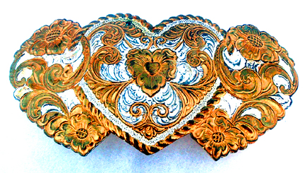 Beautiful 24K gold plated triple heart design by Crumrine Jewelers, heavy plate over jeweler's bronze. Buckle measures 4-3/4 inches wide by 2-1/8 inches tall and will accept a 1-5/8 inch wide belt.