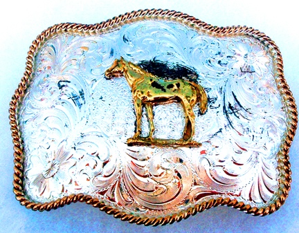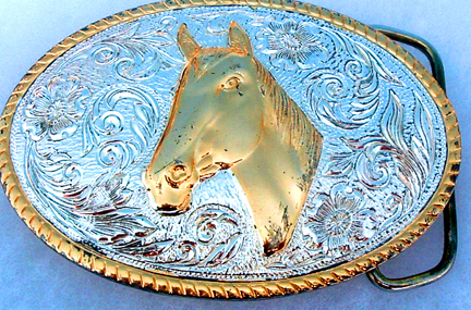 Beautiful 24K gold plated horse on a silver plated and hand etched background with gold rope triming. This beautiful Sterling Silverplate buckle is manufactured by Montana Silversmiths. Buckle measures 3-3/8 inches wide by 2-5/8 inches tall and will accept a 1-1/2 inch wide belt.