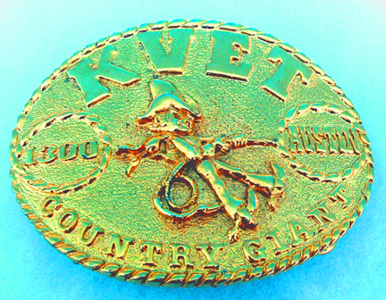 Beautiful 24K gold plated Oval KVET 1300 Austin Country Giant buckle. Classy oval buckle measures 3-3/8 inches wide by 2-5/8 inches tall and will accept a 1-7/8 inch wide belt.