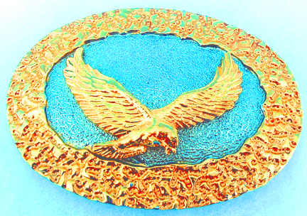 Beautiful 24K gold plated oval Buckle with golden eagle on Silver and Gold rimmed buckle. Buckle measures 3-5/8 inches wide by 2-5/8 inches tall and will accept a 1-7/8 inch wide belt.