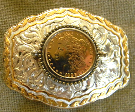 Beautiful gold and silver plated buckle with Gold Plated 1886 Silver Dollar by Crumrine Mfg. Very classy buckle. Buckle measures 4 inches wide by 3-1/4 inches tall and will accept a 1-1/2 inch wide belt.