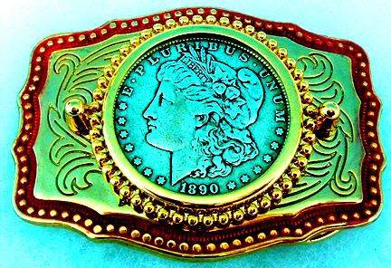 Beautiful gold and silver plated buckle with red trim and vintage Morgan Silver Dollar from the old west era. Buckle measures 3 inches wide by 2-1/4 inches tall and will accept a 1-3/4 inch wide belt.