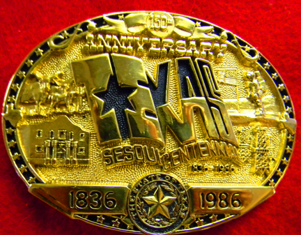 Beautiful Heavy 24K Gold Plated Texas Sesquicentennial Buckle (1836-1986). This is No. 169 of the 1986 Sesquicentennial Commemorative Buckle limited edition marked 24KGP. Never worn mint condition Buckle measures 3-3/4 inches wide by 2-3/4 inches tall and will accept a 1-7/8 inch wide belt.