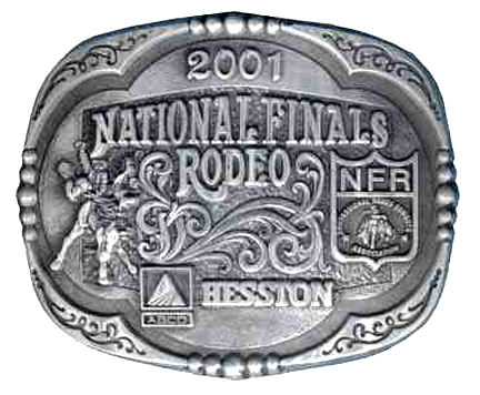 2001 Hesston Commemorative Championship Rodeo adult belt buckle; 3-1/2 inches wide by 2-1/2 inches tall and takes a belt up to 1-3/4 inches wide. Excellent condition.