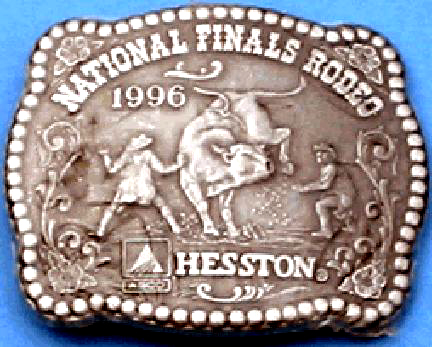 1996 Hesston Commemorative Championship Rodeo adult belt buckle; 3-1/2 inches wide by 2-1/2 inches tall and takes a belt up to 1-3/4 inches wide. Excellent condition.