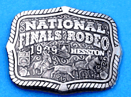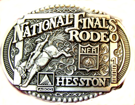 The 1991 Hesston buckle is the Eighteenth limited Collector's Buckle, 2nd in the Hesston Commemorative Series. The front has "1991 National Finals Rodeo" with floral design, bull rider, and the word "Hesston". 3 3/4" x 3"" for up to a 1 3/4" belt. the second buckle in the Commemorative Series, designed and produced by Award Design Medals in Noble, Oklahoma.