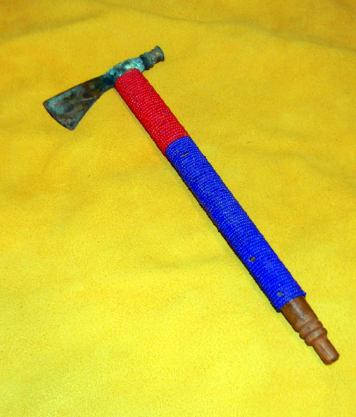 Beaded trade pipe axe 18 inches in length. Approximately 8 inches of beading along the pipe stem (red, white