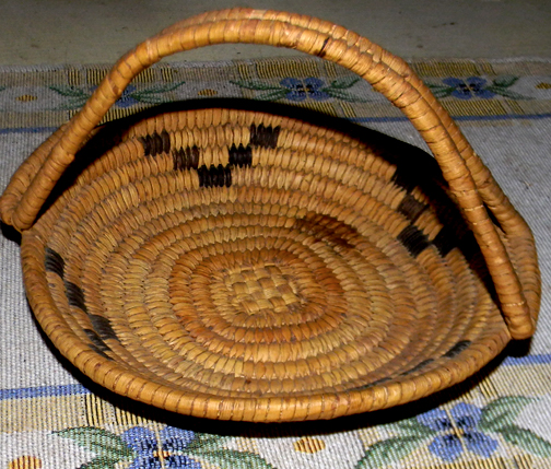 Popago basket from the Popago reservation in Southern Arizona, 7-3/4 inches diameter, approx. 1-1/2 inches tall, handle extends upwards 5 inches. Tight weave.