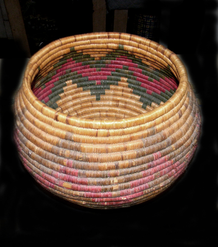 Colorful, tightly woven Native American Basket in excellent condition. Basket is 14-inches in diameter and stands 3 inches high. Usually ships in 2-3 business days SORRY, THIS ONE IS SOLD. PLEASE MAKE ANOTHER SELECTION.