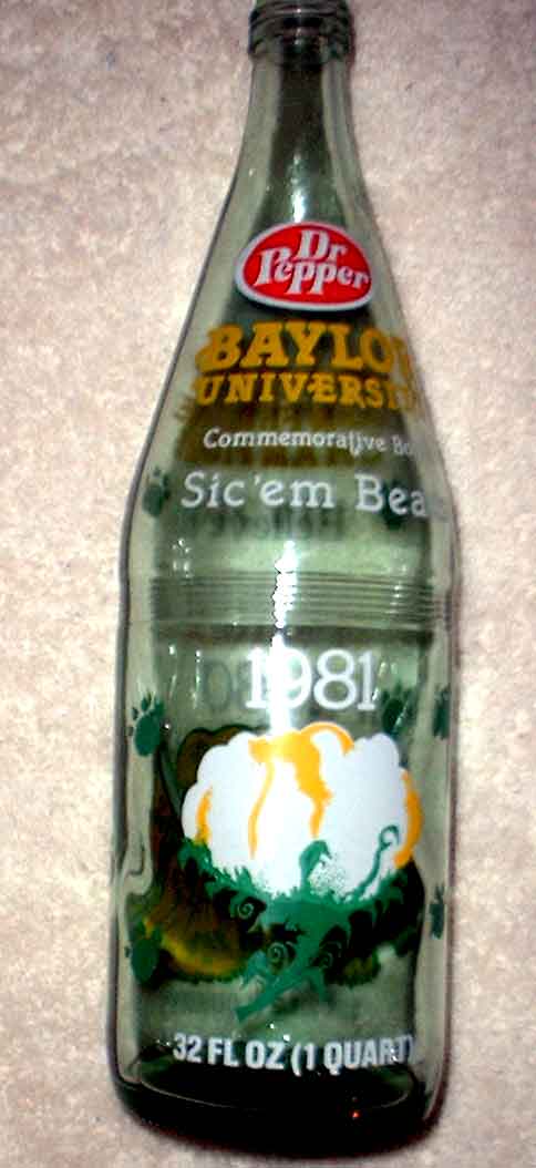 Neat commemorative 32 Oz (quart-size) Dr. Pepper Bottle celebrating the Baylor Bears New Year's Day victory in the 1981 Cotton Bowl in Dallas. Great condition. On one side, has a picture of a fighting bear with a caption 1980 Southwest Conference Champions. Green bear paw prints around the bottle. Sic Em Bears above the bowl of cotton.
