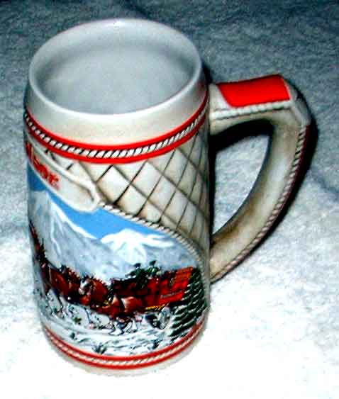 Limited Edition 1985 Beer Stein commemorating the world famous Budweiser Clydesdales. This Stein illustrates the hitch journeying through snow capped mountains on a crisp winter's morn.