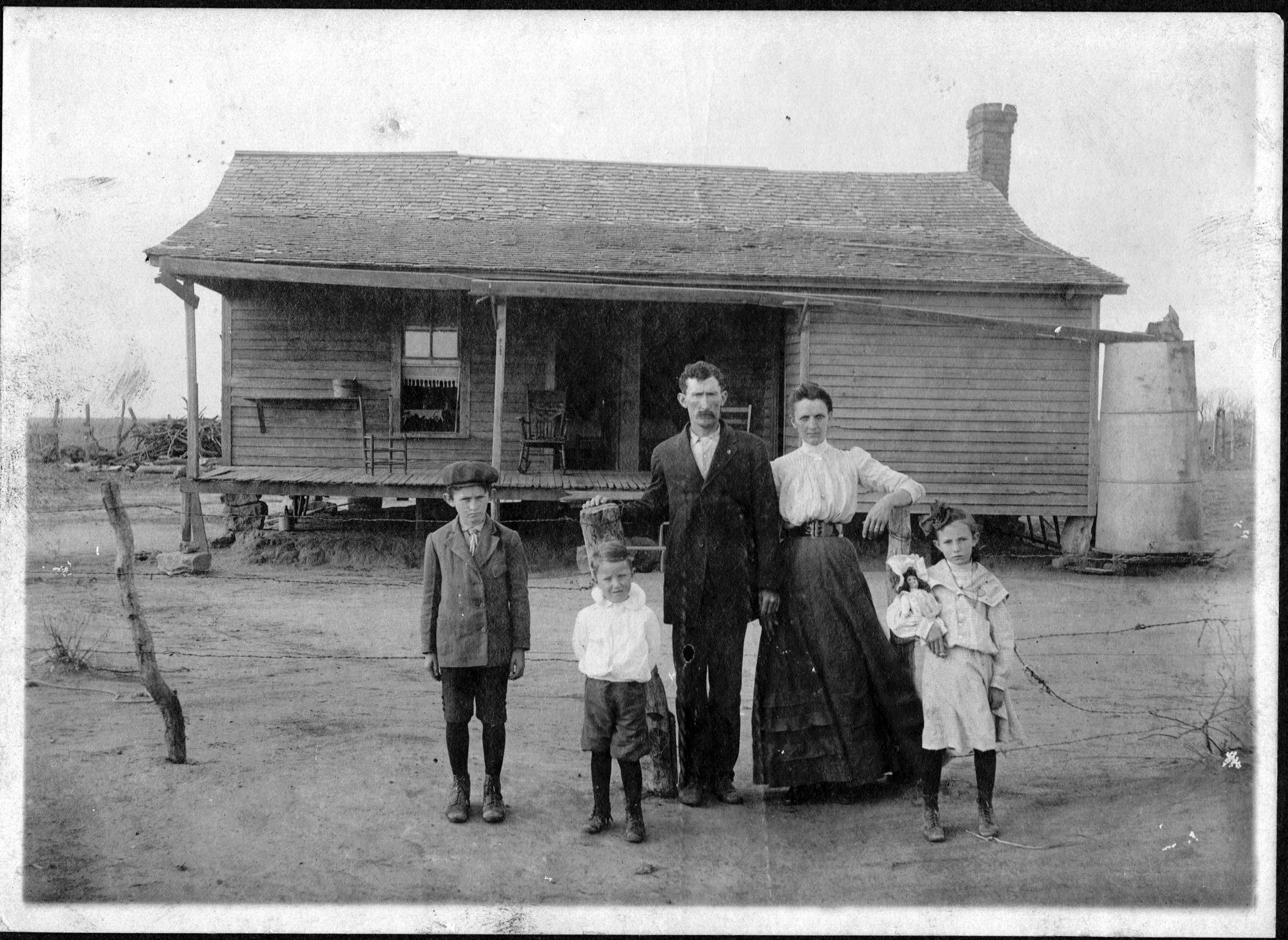 Cousins Robert, Jessie, Maurine, Ouida and infant child (Daisy Julia Adams Magee) of George and Della Tate Adams of Kosse Texas. At far right is Mary A. Hawkins Adams.