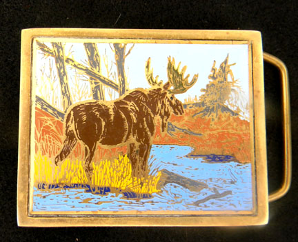 Original highly-sought after Colorful heavy brass belt buckle featuring a bull moose in a stream. This one is a beauty. Buckle is 2-7/8 inches wide, 2-1/4 tall, and accepts a belt up to 1-3/4 inches wide. Usually ships in 5-7 business days.