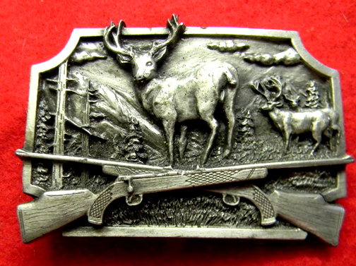 Nice collectible belt buckle featuring Deer and crossed rifles. Rugged pewter Buckle,manufactured by Siskiyou Buckle Company in 1982, is 3-5/8 inches wide, 2-5/8 inches tall, and accepts a belt up to 1-5/8 inches wide. Usually ships in 2-3 business days.