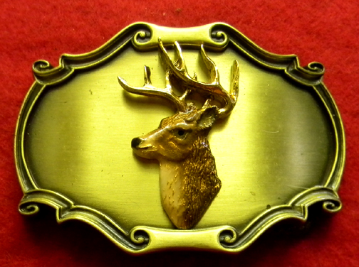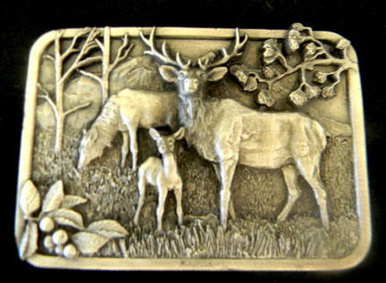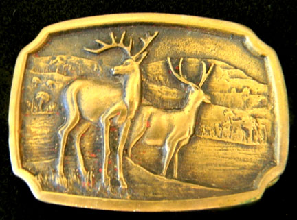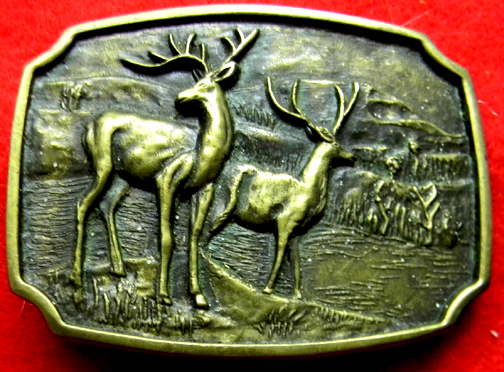 Solid brass belt buckle , featuring two deer near a stream. Buckle is 3-1/8 inches wide, 2-3/8 tall, and accepts a belt up to 1-1/2 inches wide. Usually ships in 2-3 business days.