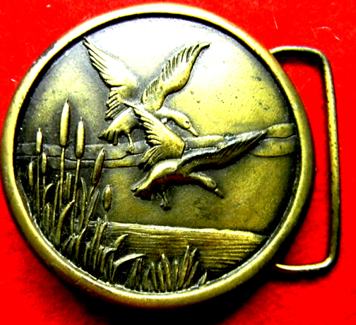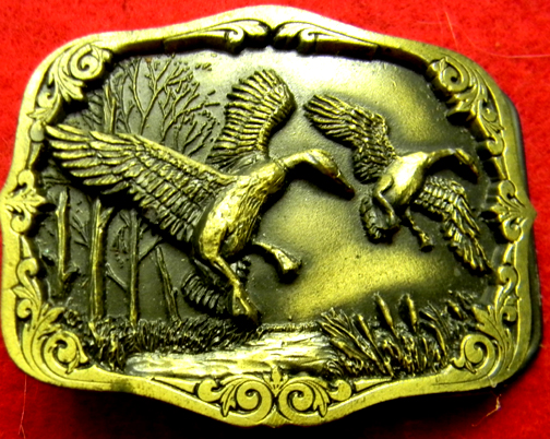 Heavy brass belt buckle featuring a pair of wild ducks in flight. Buckle is 2-7/8 inches wide, 2-3/8 inches tall, and accepts a belt up to 1-3/4 inches wide. Usually ships in 2-3 business days.