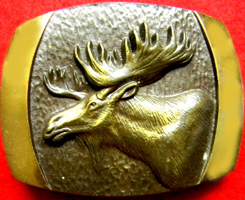 Neat Moose brass belt buckle , featuring a closup of a bull moose. Classy Buckle is 3-1/4 inches wide, 2-1/2 inches tall, and accepts a belt up to 1-1/2 inches wide. Usually ships in 2-3 business days