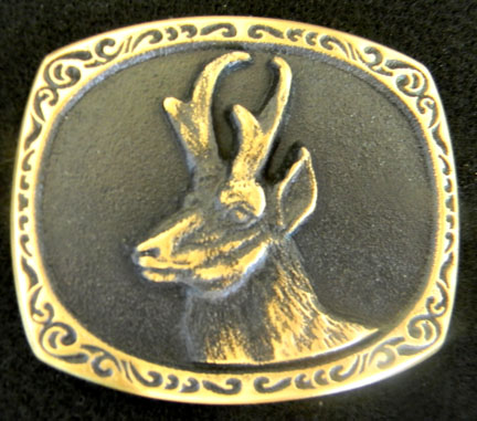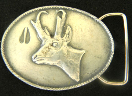 Nice pewter belt buckle featuring the antelope. Buckle is 2-7/8 inches wide, 2-1/8 inches tall, and accepts a belt up to 1-3/4 inches wide. Usually ships in 2-3 business days.