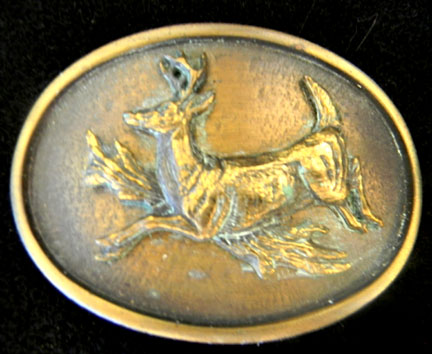 Oval brass belt buckle with deer running. Buckle is 3-3/8 inches wide, 2-1/2 tall, and accepts a belt up to 1-3/4 inches wide. Usually ships in 2-3 business days.