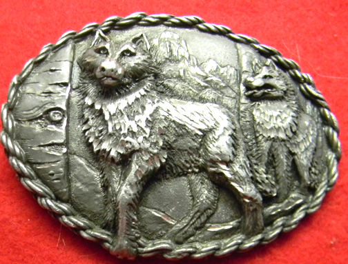 Nice collectible 3D pewter belt buckle featuring a pair ofWolves in the mountains. The buckle, manufactured by Siskiyou in 1983, is 3-5/8 inches wide, 2-7/8 inches tall, and accepts a belt up to 1-3/4 inches wide. Usually ships in 2-3 business days.