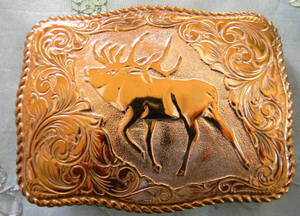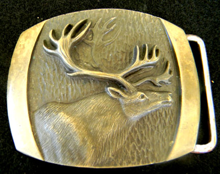 Great buckle with elk design. Manufactured by Colorado Silver Starr, this beautiful buckle measures 3-1/2" wide X 2 1/2" tall and accepts a belt up to 2 inches wide.