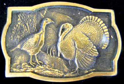 Solid brass belt buckle featuring a pair of wild turkeys. Buckle is 3-1/4 inches wide, 2-1/8 tall, and accepts a belt up to 1-1/2 inches wide. Usually ships in 2-3 business days.