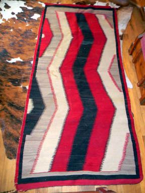 Great old west collectible- This is an antique weaving 43 inches wide by 91 inches long. The Navajo weaving has vivid reds, blacks and Ivory colors. Some fraying along the top and bottom edges but displays well. Overall in great condition for its age of over a 100 years. A very unique old west collectible.