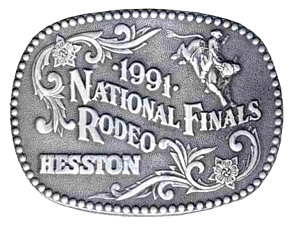 The 1991 Hesston buckle is the Eighteenth limited Collector's Buckle, 2nd in the Hesston Commemorative Series. The front has "1991 National Finals Rodeo" with floral design, bull rider, and the word "Hesston". 3 3/4" x 3"" for up to a 1 3/4" belt. the second buckle in the Commemorative Series, designed and produced by Award Design Medals in Noble, Oklahoma.
